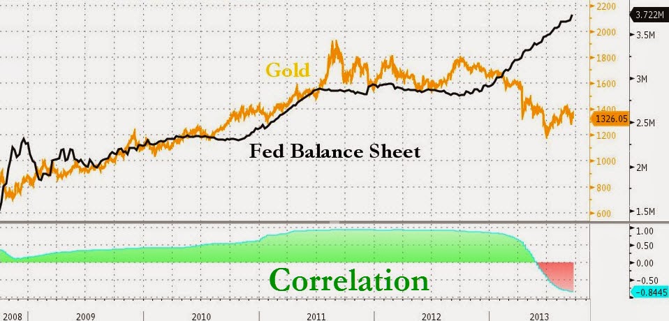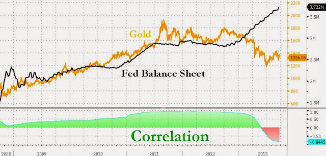 Esiste anche un rapporto fra la quotazione del metallo giallo e l’insieme delle espansioni dei bilanci di tutte le banche centrali del mondo, non solo la FED americana. Pare che un’ancora di valore per i loro fogli di bilancio sia proprio fisicologica.